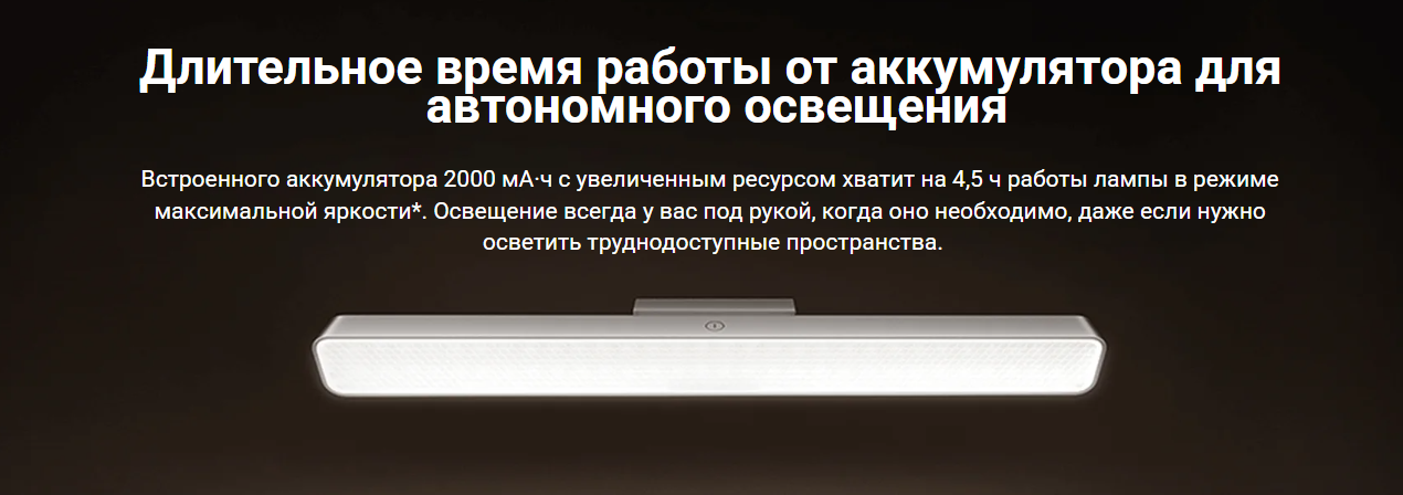 Устройство работает от встроенного аккумулятора и обеспечивает до 4.5 часов работы без подзарядки. Это позволяет использовать лампу без привязки к розетке.